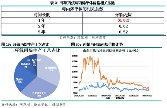 环氧丙烷与丙烯价格之间的相关性较弱,五年期相关性仅为0.52左右,从更短周期来看,近一年内的环氧丙烷与丙烯价格更是已经呈现负相关。这主要是因为环氧丙烷的生产工艺较多,目前环氧丙烷最主要的三种生产工艺分别是以丙烯和双氧水作为原料的直接氧化法、以乙烯、丙烯以及纯苯作为原料的乙苯共氧化法和以丙烯和液氯作为原料的氯醇法。虽然在这三种工艺中,丙烯都作为环氧丙烷的主要生产原料,但在不同生产工艺中,丙烯价格对其生产利润的影响程度存在明显差异,这就导致在辅料价格波动较大的情况下,丙烯价格的波动对于环氧丙烷价格的影响程度减弱,进而降低丙烯单体与环氧丙烷价格之间的相关性。