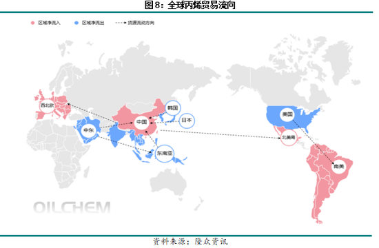 由于丙烯的运输存在难度,因此其货源流通多以近洋区域内自平衡为主,远距离跨区域流通量相对较小。美国是美洲地区的丙烯主要生产国,其富余丙烯大多流向了南美洲地区,比如哥伦比亚以及墨西哥境内。东北亚地区以中国为核心形成了区域内自平衡的丙烯供应链体系。