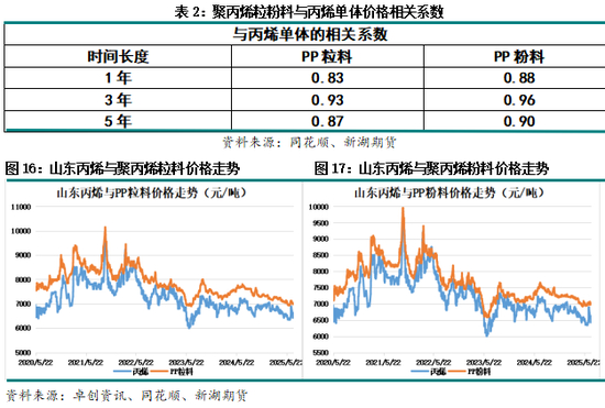 聚丙烯(PP)是丙烯下游最主要的终端需求,在丙烯下游需求中的占比高达70%,并且一直到2027年以前,聚丙烯仍然有大量新装置计划投放,因此聚丙烯在丙烯终端中的占比将会继续提升。从生产链来看,丙烯单体是聚丙烯最直接也是最主要的上游原料,而聚丙烯是丙烯最重要的下游产品,因此两者价格有着较高的相关性,根据测算,长周期来看聚丙烯粒料与丙烯单体的相关系数为0.87,聚丙烯粉料与丙烯单体的相关系数要略高于粒料,为0.90。