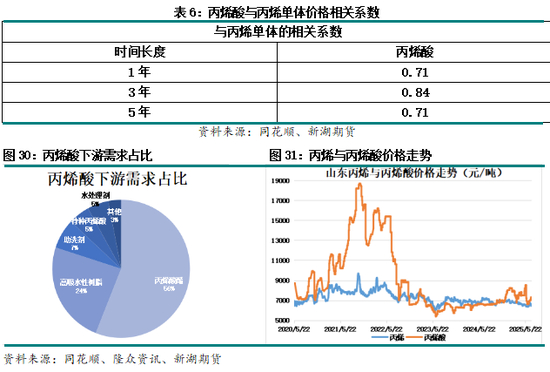 丙烯酸的生产地区主要集中于亚洲、北美以及西欧地区,生产相对集中,并且丙烯酸大多为大企业,以上下游一体化生产模式为主,根据国内的情况来看,国内有将近七成的产能配备有上游丙烯生产装置,而且其中接近80%都是丙烷脱氢工艺(PDH),因此丙烯酸价格与丙烷价格同样存在较高的相关性。中国丙烯酸产能同样处在过剩的压力之下,丙烯酸整体盈利水平持续缩减,在最低时甚至出现过亏损的情况,受此影响,未来丙烯酸供应增速预计环比降低,对于丙烯的消耗速度也难有明显增长。
