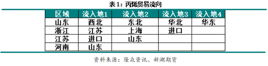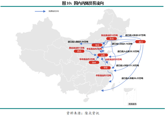 从贸易流向上来看,山东省是我国丙烯资源的主要调入省份,包括东北、西北、华北以及华东等地区的过剩丙烯资源均会流向山东地区,其中西北、华北以及华东多通过汽运运输,东北地区则通过汽运和船运来运输。