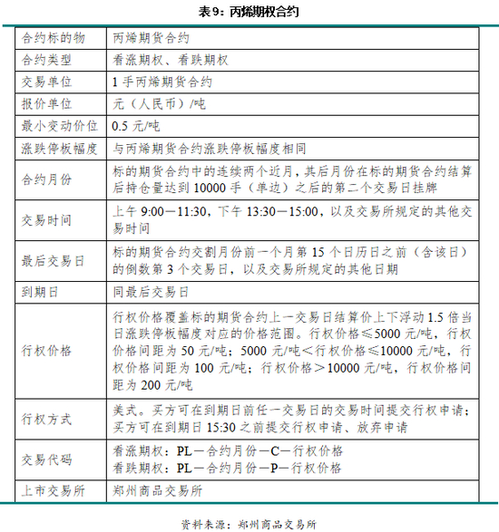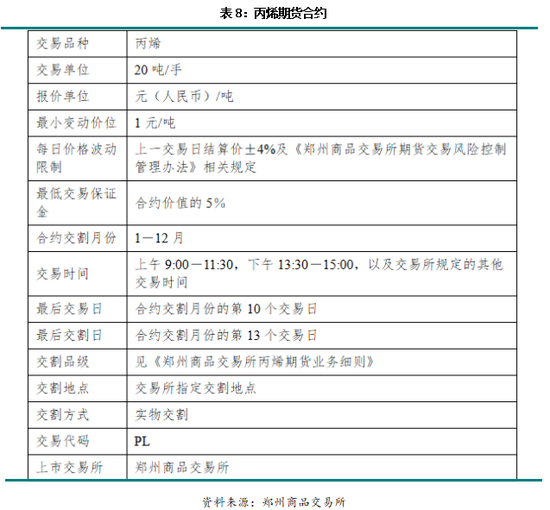 2025年5月30日,郑商所发布丙烯期货和期权合约及期货业务细则征求意见的公告,这意味着我国产量最大的烯烃品种期货和期权的上市进程加速。根据征求意见稿,丙烯期货合约交易代码为PL,交易单位为20吨/手,最小变动价位为1元/吨,涨跌停板幅度为上一交易日结算价的±4%,最低交易保证金为合约价值的5%。合约月份为1-12月,最后交易日和最后交割日分别为合约交割月份的第10个交易日和第13个交易日,交割方式为实物交割。