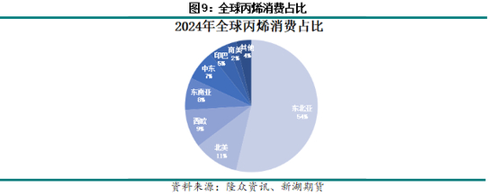 从全球来看,北美洲、中东和东欧地区是主要的丙烯流出地区,而南美洲、西北欧和东北亚地区则是丙烯的主要流入区域,其中主要进口国为中国、德国、法国和哥伦比亚等。东北亚是全球最大的丙烯消费地区,占全球丙烯消费的54%,中国是最主要的消费国。全球丙烯进口量的峰值出现在2019年,此后随着中国丙烯产能的快速提升,中国对于进口丙烯的需求量减少,导致全球丙烯进口量保持下滑趋势。