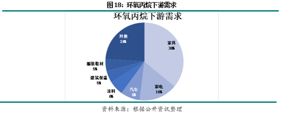 环氧丙烷(Propylene Oxide,简称PO)是丙烯第二大下游,同时也是近年来在丙烯下游中增速亮眼的产品。环氧丙烷最大用途是合成聚醚多元醇,在环氧丙烷下游需求中还在占比超过80%,聚醚多元醇可以与TDI/MDI反应进一步合成包括软泡聚醚、硬泡聚醚在内的聚氨酯高分子材料,这些材料被广泛用于软体家具、汽车、冰箱冷柜、建筑保温材料及防水涂料等产品,因此环氧丙烷的需求与地产和家电息息相关。此外,环氧丙烷还可用于表面活性剂、润滑剂等行业,也可与二氧化碳共聚制造可降解塑料(PPC)。我国是全球环氧丙烷产能最大的国家,在全球产能中占比达到30%,同时也是环氧丙烷最大的消费国。
