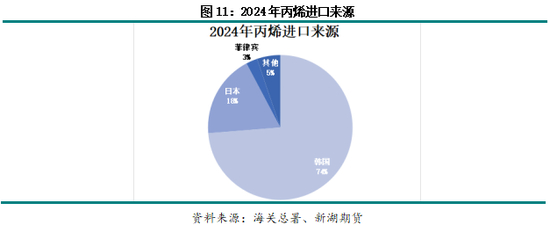 丙烯的进口大多来自于亚洲地区,主要进口来源地是韩国以及日本。2024年韩国共计向中国出口了148.9万吨丙烯,是中国最大的丙烯进口来源国,占中国丙烯总进口的比例达到73.8%,日本向中国出口了37.4万吨丙烯,仅次于韩国,占中国丙烯总进口的18.5%。韩国与日本两国距离我国大陆较近,丙烯主要生产工艺为蒸汽裂解,产出的丙烯品质较好,因此成为中国丙烯进口的首选国家,两国合计占据中国丙烯进口量的92.3%。曾经中国台湾也是中国重要的丙烯进口地区,但受到2024年中国调整了丙烯的进口关税政策,将对中国台湾的关税从原来的零关税提高至2%,再加上国内相关企业内部装置配置的调整,导致中国台湾对中国大陆的丙烯进口量出现了明显降低,从2023年的29万吨下降至2024年的2万吨,在中国丙烯进口中的占比也从2023年的12.3%下降至2024年的1.2%。
