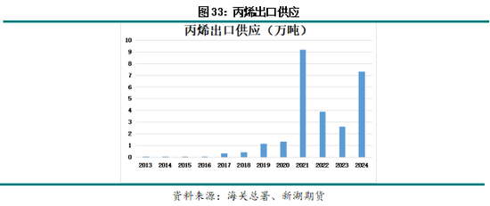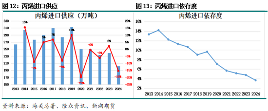 自2014年国内丙烯产能的爆发式投产以来,国内丙烯供应逐渐转向宽松,进口丙烯在丙烯供应中的占比不断下滑,2024年丙烯的进口依存度已经下降至3.6%左右,从长期来看,随着中国丙烯产能的进一步释放,国内丙烯供应充足,对于丙烯进口的需求降低,中国丙烯的进口依存度预计将会进一步下降。