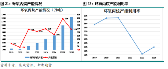 在2021年之前,我国环氧丙烷有着较大的产能缺口,叠加下游需求的快速提升,环氧丙烷华东价格一度上涨19500元/吨的高点,在整个C3产业链中表现极为亮眼,有着十分丰厚的生产利润,因此吸引了大量投资者入场,自2021年开始,环氧丙烷的产能快速提高,产能增速从2020年的-2%大幅提升至2021年的20%以上,并且连续三年都保持每年20%以上的高增速,根据计划来看,2025年到2026年环氧丙烷仍有大量新产能计划投放,环氧丙烷产能将会继续提高。随着环氧丙烷的大量投产,再加上下游需求其供需格局逐渐由供不应求转向宽松,环氧丙烷的盈利空间缩水明显,环氧丙烷在丙烯下游需求中的占比难有明显提升。