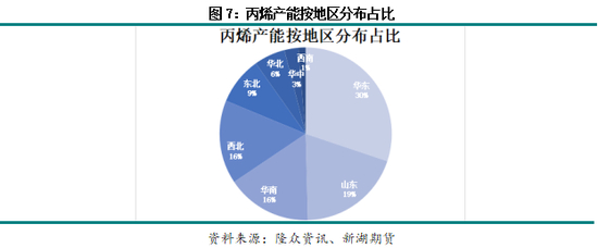 从国内丙烯的地域分布上来看,国内丙烯的产能大多集中于沿海地区,同时这些地区也是丙烯的主要消费地。丙烯产能最集中的区域是华东地区,产能占比达到30%,虽然当地油气资源不足,但华东地区位于沿海,方便进口原料的运输,再加上民营企业众多,因此华东地区新兴工艺产能占比较高,并且单套装置产能较大;其次为山东,占比为19%,山东地区丙烯生产工艺丰富,从传统的炼油工艺到新兴的丙烷脱氢工艺一应俱全,而且山东地区下游产业丰富,现货贸易活跃;华南地区排第三位,占比为16%,近年华南地区的新产能投产集中,占比快速上升,华南地区的丙烯产能主要企业大多隶属于三桶油旗下,产能特点是生产方式大多选择传统工艺,并且基本都配套有下游装置,对外销售的丙烯单体较少。