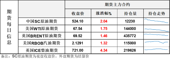 【1】WTI主力原油期货收涨1.16美元,涨幅1.75%,报67.54美元/桶;布伦特主力原油期货收涨1美元,涨幅1.46%,报69.52美元/桶;INE原油期货收涨2.04%,报524.1元。
