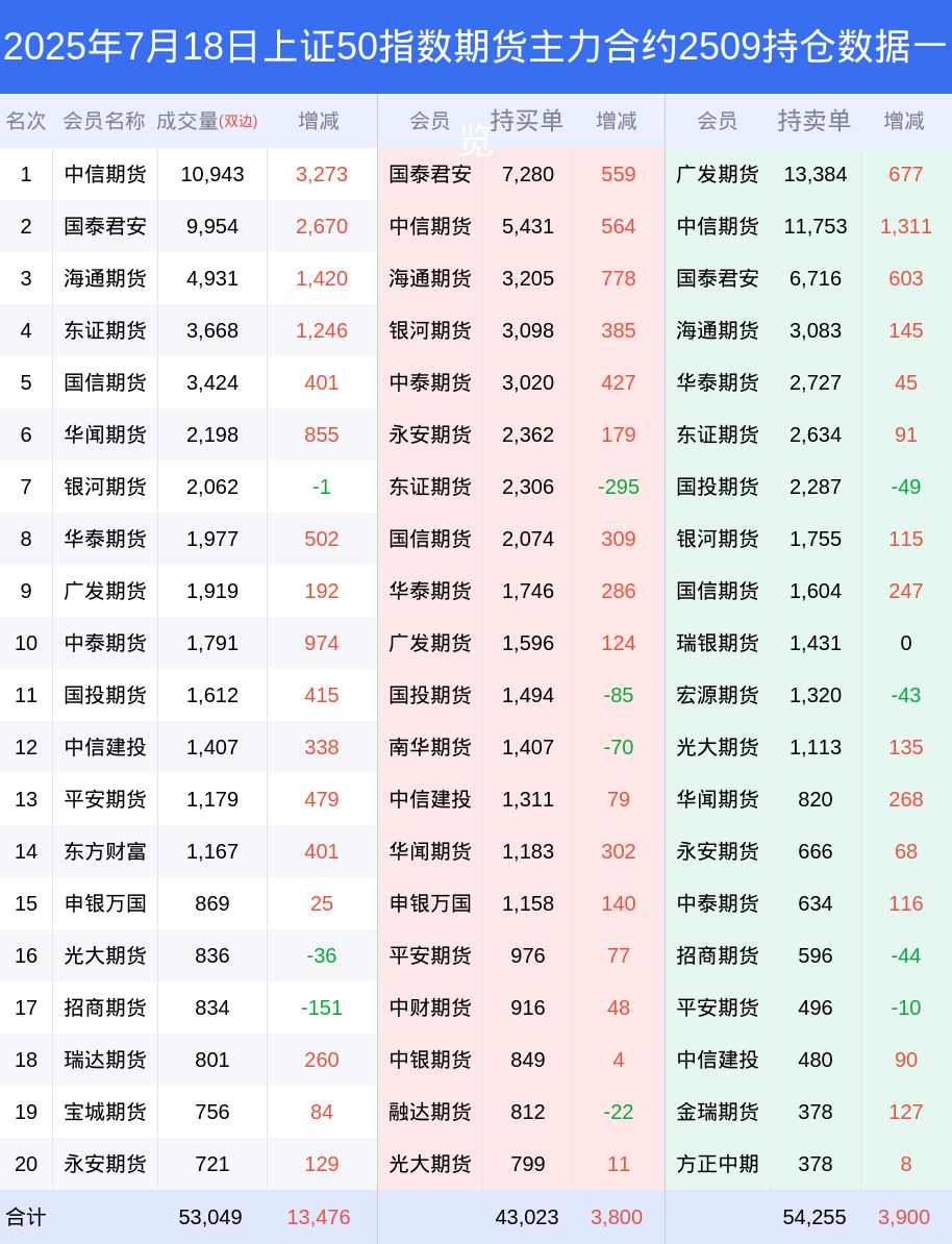 新浪期货 根据交易所数据,截至7月18日收盘主力合约上证50指数期货2509,涨跌+1.05%,成交量3.53万手,持仓数据显示前20席位呈现净空,差额头寸为11232手。