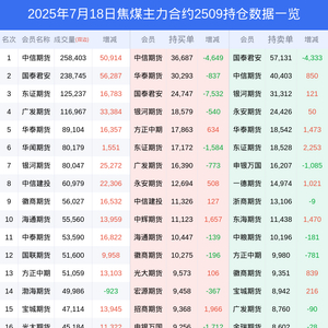 新浪期货 根据交易所数据,截至7月18日收盘主力合约焦煤2509,涨跌+2.55%,成交量131.65万手,持仓数据显示前20席位呈现净空,差额头寸为46898手。