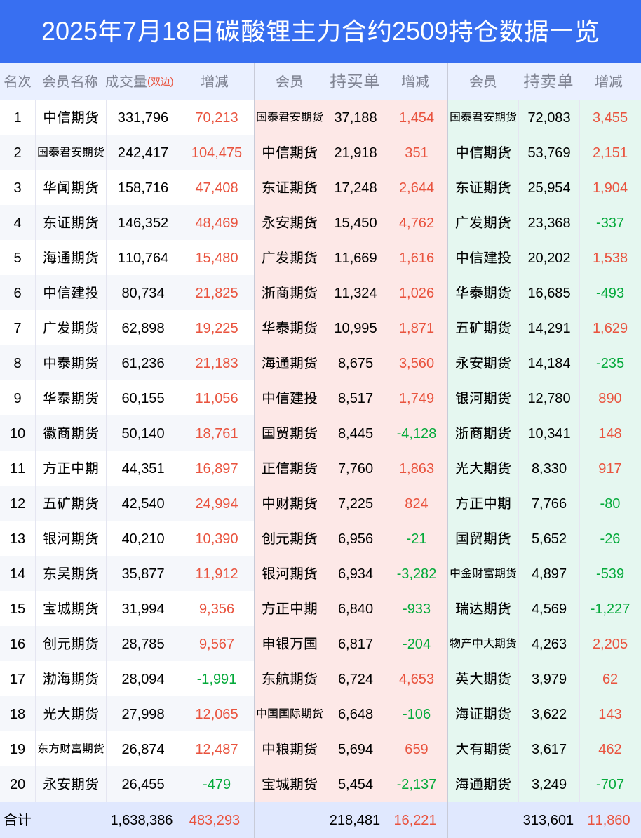 新浪期货 根据交易所数据,截至7月18日收盘主力合约碳酸锂2509,涨跌+2.82%,成交量120.63万手,持仓数据显示前20席位呈现净空,差额头寸为95120手。
