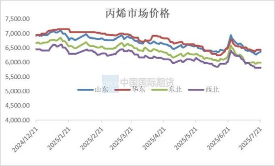 2025年上半年以来国内丙烯市场价格高开低走,弱势下行。丙烯新增产能逐步释放叠加需求疲软,成为丙烯价格下跌的主要原因。截止6月底,山东丙烯市场上半年均价6712元/吨,同比下跌3%。2025年1月中旬山东丙烯价格最高点价格为7115元/吨,华东丙烯最高点价格为7150元/吨。当时主要推涨原因为下游厂家年前备货、年后补仓;美国制裁俄罗斯、叠加寒冷天气影响,国际油价以及丙烷市场价格提升;叠加供需面利好支撑,丙烯市场价格上涨。随后丙烯新增产能落地,下游需求跟进不足,关税政策博弈,丙烯市场价格弱势下行。