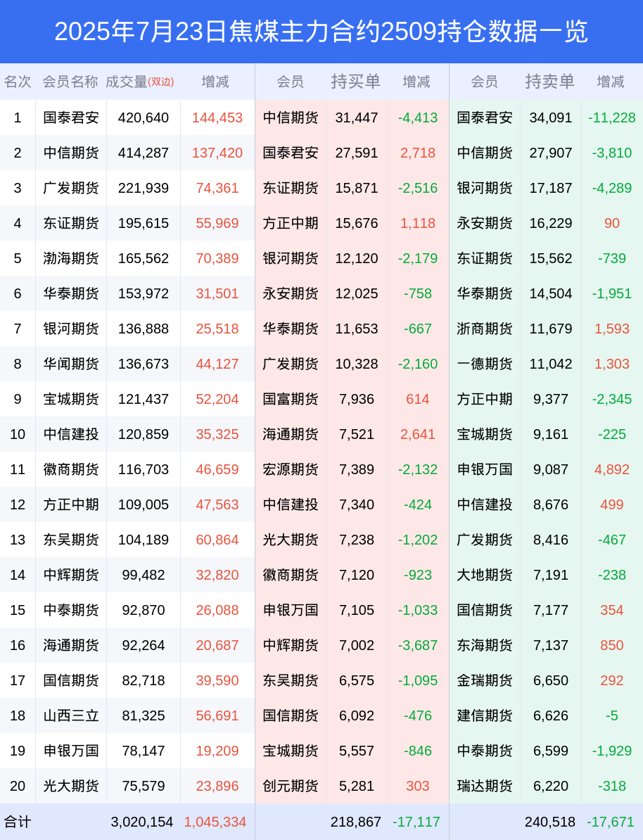 新浪期货 根据交易所数据,截至7月23日收盘主力合约焦煤2509,涨跌+11.00%,成交量252.71万手,持仓数据显示前20席位呈现净空,差额头寸为21651手。