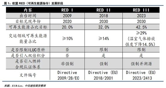 RED(可再生能源指令,Renewable Energy Directive)是欧盟为了推动可再生能源发展的核心法律文件,最早在2009年出台。在RED I 阶段,欧盟提出了到2020年,可再生能源在最终能源消费/交通领域能量中占比分别达到20%和10%的目标,有效刺激了菜籽油、大豆油、棕榈油及UCO等传统农作物的工业需求增长。