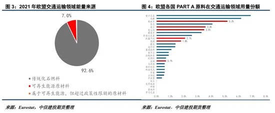 根据Eurostat的统计,2021年可再生能源原材料在交通运输领域的能量占比只有7%,而PART A部分原材料的平均能量份额只有2.1%,即便按照2倍计算影响力也比较有限。同时,德国、法国、波兰、罗马尼亚等油菜籽主产区的PART A原料占比均低于欧盟平均值,不难看出“第一代生物燃料”禀赋较好的国家在“先进生物燃料”的使用方面执行积极性相对偏弱。总的来说,PART A部分原材料目前影响力有限。