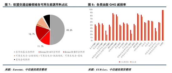 3大考核指:整体可再生能源占比、交通运输领域可再生能源能量占比、考核温室气体GHG减排率。其中,可再生能源的包含范围较广,包括生物燃料、可再生电力、再生碳燃料等,不能简单理解为生物柴油的强制掺混比例或生物燃料的能源占比。RED政策大概包括交通运输、电力和供热&制冷3个领域,和生物燃料&生物柴油相关度较高的是交通运输领域。对交通领域可再生能源能量占比的要求才是与生物燃料&生物柴油需求相关度较高的考核目标。然而,RED政策所指的“可再生能源”并不是大众意义上的“生物柴油”,其在Annex 附录部分列举了各生物燃料的温室气体减排效率,将减排效率高的原材料称之为“先进生物燃料”。在RED III中,成员可以用温室气体“GHG减排率”取代原有的“能量占比”考核目标,实质是希望成员国更多地使用“先进生物燃料”。