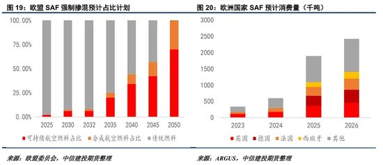 2025年是欧盟SAF强制掺混落地的第1年,尽管硬性比例只有2%,但根据ARGUS估计欧盟+英国SAF消费量将比达到190万吨,比2024年增加130万吨。然而,IATA在25年6月表示目前欧洲SAF合规成本已经抬升到传统航煤的5倍以上,如果核算其生产成本,已经没有环境效益。包括Ryanair和Air France‑KLM在内的许多欧洲航空公司已经呼吁调整SAF掺混目标,理由是满足条件的SAF数量不达预期且价格过高,成本压力太大。