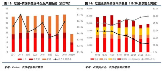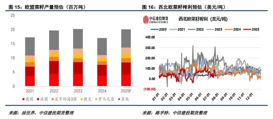 然而,近年来针对RED 的质疑声音此起彼伏。欧盟审计院(ECA)曾在报告中指出“多数成员国未达成2020年之前交通燃料可再生能源占比≥10%的目标”,且2030年之前可再生能源占比≥14%的进展十分缓慢。此外,关于“来自东南亚的棕榈油原材料间接导致森林砍伐”、“UCO跨国转口/认证套利”、“可食用的棕榈油被包装成POME用于出口”等讨论层出不穷。2025年1月,欧盟甚至正式采取了对中国生物柴油以及氢化植物油的反倾销关税,执行期5年。最后,包括德国在内的菜籽种植国家也抱怨所谓“先进生物燃料”享有的“双倍积分”激励导致传统农作物菜籽油等的工业需求份额被挤占。在2024年欧盟菜籽出现严重减产的背景下,欧洲菜籽压榨利润并不达预期。