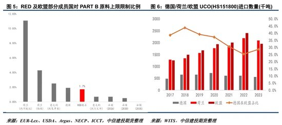 可以说,对PART B部分原料的限制程度是目前RED政策当中的博弈重心之一。如果完全按照RED文件要求限制UCO的增加比例,那么理论上欧盟UCO的工业需求将受到极大约束。从WITS统计的表观进口数据来看,2022年欧盟UCO进口数量达到顶峰,约241万吨,2023年回落至196万吨,而RED III正是2023年出台的。