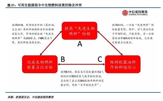因此我们认为,当前RED政策已经在实质上触发了“三角不可能”冲突。从当前的实施思路来看,欧盟更强调“提高‘先进生物燃料’份额”和“达成生物燃料能量占比目标”2类目标,而主要舍弃的是维持欧盟油料作物种植信心。不过,传统农作物产业在提供就业和税收收入上仍具有较大话语权,且舍弃农作物原料必然意味着合规生产成本的抬升,如果欧盟财政难以维持能源战略,前2类目标的实施又从何说起呢?