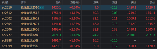 本周三,连续回落的欧线集运期货盘面有所企稳。其中,主力合约EC2510盘中一度达到1466.8点,随后涨幅有所回吐,最终收于1420.1点;EC2512收于1751.4点,涨幅为4.12%。