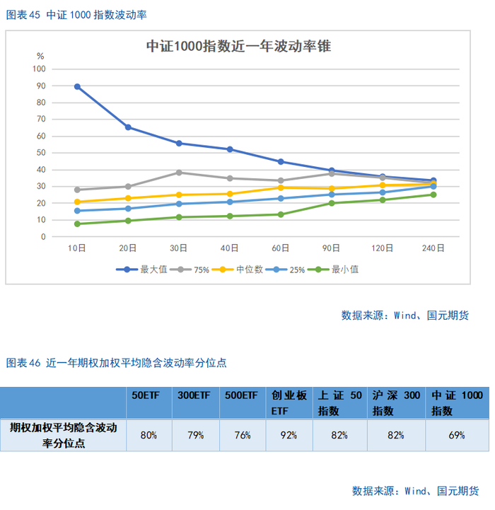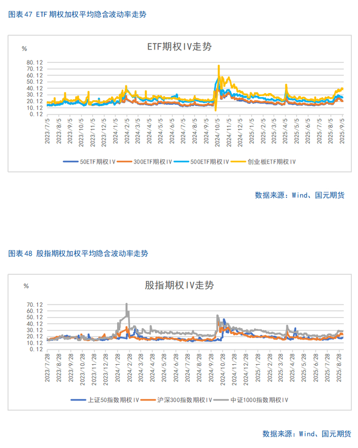 股指上周波动较大,期权加权平均隐含波动率整体维持在较高水平。当前各标的期权加权平均隐含波动率在20%-38%附近,整体处在近年较高水平。现货指数波动较大,市场对于股指大幅波动预期上升。