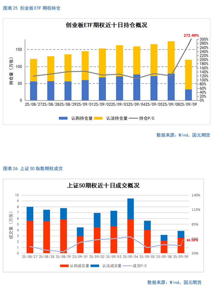 上周两市整体冲高回落,主要股指收跌,沪指下跌 1.18%,创业板则逆势大涨 2.35%。两市日均成交额有所走低,但仍处于历史极高水平,显示市场热度并未出现明显降温。与此同时,股指期货贴水有所扩大,期权持仓 PCR 指标下行,反映出市场分歧可能进一步加大。