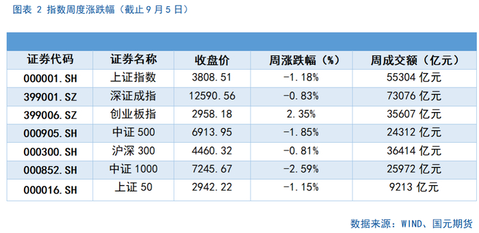 上周两市整体冲高回落,主要股指收跌,沪指下跌 1.18%,创业板则逆势大涨 2.35%。两市日均成交额有所走低,但仍处于历史极高水平,显示市场热度并未出现明显降温。与此同时,股指期货贴水有所扩大,期权持仓PCR指标下行,反映出市场分歧可能进一步加大。