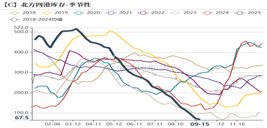 因市场对预期较为悲观,9月以来玉米2511合约以及2601合约基差持续反弹,上周在近月基差回归的驱动下,2511合约触底反弹,基差呈现小幅回落,而2601合约反弹幅度有限,可以看出市场悲观预期的情绪并未缓解,只是基于期现价差较大,被动回归。短期随着供给端持续上量,期现或将通过现货价格下跌继续带动期货价格偏弱震荡,实现基差收敛,但港口库存及中下游库存较低,加上或有国家收储政策托底,不宜趋势性看跌。