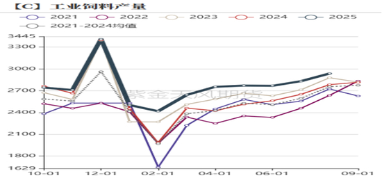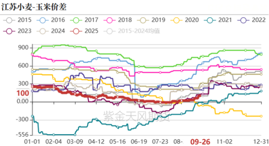 今年进口玉米实际补充量较少,但国内玉米供应端依然较为充裕,这主要是小麦的替代。2025年小麦产量环比增幅为4%左右,但由于下游需求相对低迷,今年小麦供需呈现过剩状态,自小麦上市以来,华北华中以及华东地区的小麦与玉米价差几乎平价,因此在饲料端小麦对玉米有替代优势,预期2025年小麦对玉米在饲料端的替代在2000万吨-3000万吨之间。9月以来随着面粉企业开机率逐步回暖,小麦社会库存压力逐渐缓解,小麦价格开始震荡反弹,小麦玉米价差也逐步走高,加上玉米进入集中上市期,预期四季度小麦对玉米的替代将逐步减少。