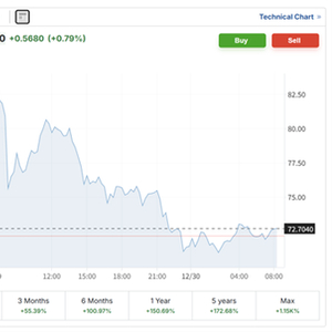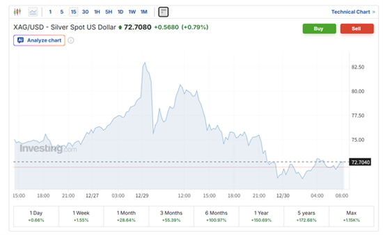 上周五,银价创下历史最大单日美元涨幅,但周一呈现出 “急涨急跌” 的过山车走势:现货银从最高上涨近6%,到一度下跌近11%,日内振幅超过16个百分点。周二亚市交易时段,银价交投在72美元附近。