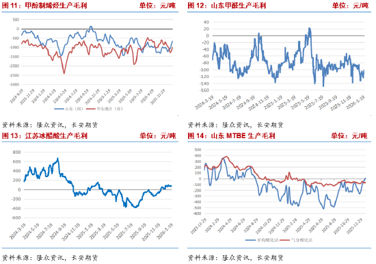 成本方面,各制法装置亏损均有所扩大或盈利收缩。煤制甲醇方面,成本环比下降但利润持续恶化,成本下降主要受益于前期煤价回落,但受甲醇现货价格区域分化影响,利润空间进一步压缩,多数煤制甲醇企业处于亏损状态。天然气制甲醇方面,成本稳定,但受川渝地区现货价格下跌影响,生产亏损幅度进一步扩大。焦炉气制甲醇方面,成本同样稳定,但受下游需求疲软及区域内甲醇价格下跌影响,盈利收缩。