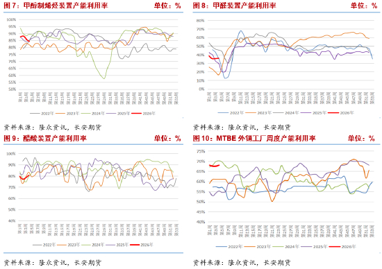 传统下游多数行业开工率环比小幅回升但同比仍有差异。冰醋酸装置产能利用率80.67%,环比上涨2.27个百分点,主要受下游醋酸乙酯需求小幅回暖带动,但同比下降7.55个百分点,整体需求仍不及去年同期;二甲醚装置产能利用率5.33%,环比上涨1.53个百分点,同比下降2.3个百分点,受液化气价格波动影响,行业开工维持低位;甲醛装置产能利用率35.68%,环比微涨0.28个百分点,同比上涨5.8个百分点,房地产行业节前备货略有启动,带动需求小幅改善;山东MTBE装置产能利用率68.01%,环比上涨0.44个百分点,同比上涨12.74个百分点,受益于汽油需求稳步恢复,行业开工保持相对高位。整体来看,传统需求虽有边际改善,但力度有限,难以对甲醇市场形成强力支撑。