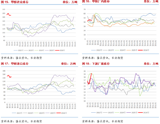 上周国内甲醇社会库存189.59万吨,环比增加0.97万吨,同比增加66.66万吨,库存仍处于历史同期高位,对价格形成一定压制。分结构来看,港口库存145.75万吨,环比增加2.22万吨,同比增加52.78万吨。尽管进口缩量预期强烈,但前期到港货源仍在消化过程中,港口去库进度不及预期。厂家库存43.84万吨,环比减少1.25万吨,同比增加13.89万吨,内陆厂家受价格下跌影响,主动去库意愿增强,通过降价促销消化库存,导致厂家库存小幅下降,但同比仍处于高位,整体供应过剩格局未改。下游企业库存19.24万吨,环比增加2.04万吨,同比增加1.78万吨,部分下游企业为应对春节假期,提前进行小幅补库,导致库存环比上升,但补库力度谨慎,未出现大规模备货现象。