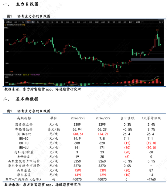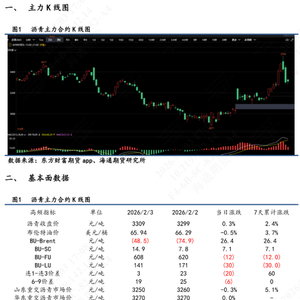 【1】期货盘面:BU 2603主力合约日内低位震荡,跟随市场风险偏好回落,也跟随能源板块悲观情绪释放。收盘价3309,较昨日收盘价跌幅1.72%,盘中最高触及3331,最低3283。06远月合约涨幅1.52%。