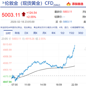 现货黄金再度站上5000美元/盎司 日内涨幅超2.5% 市场资讯 02.18 23:07 外盘期货走势图 2月18日,国际贵金属价格持续走高,现货黄金再度站上5000美元/盎司,日内涨超2.5%。现货白银涨近6%,报77.8美元/盎司。