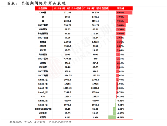 节前海外市场呈现明显的风偏回落,而长假期间,海外商品市场呈现反弹,金、银、铂、钯等贵金属上行;原油价格大幅回升,带动海外油脂油料走强。当前地缘、政策、经济的多重因素交织,商品市场的驱动源于: