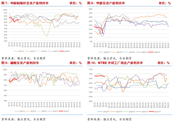 受春节假期影响,多数下游行业呈现季节性疲软态势,开工率普遍下滑,对甲醇需求形成明显拖累。具体来看,冰醋酸装置产能利用率80.09%,环比下降1.63个百分点,同比下降10.65个百分点,受下游醋酸酯行业需求疲软及企业春节检修影响,开工率小幅下滑,对甲醇的采购需求减少;二甲醚装置产能利用率5.46%,环比下降0.55个百分点,同比下降1.31个百分点,二甲醚行业需求持续低迷,企业开工意愿极低,需求端对甲醇的拉动作用微弱;甲醛装置产能利用率19.25%,环比下降11.6个百分点,同比下降11.6个百分点,作为传统下游中受房地产行业影响最大的领域,甲醛行业节前逐步停工放假,开工率大幅下滑,成为传统需求中拖累最大的板块;山东MTBE装置产能利用率67.87%,环比下降0.14个百分点,同比上涨8.83个百分点,整体开工相对稳定,同比上涨主要得益于汽油需求的稳步复苏,对甲醇需求形成一定支撑,但节后复工进度缓慢,需求尚未完全释放。整体来看,传统下游需求仍处于季节性低谷,节后随着企业逐步复工,需求有望缓慢复苏,但短期内难以形成有效拉动,整体需求端仍显疲软。
