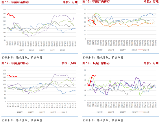 分库存类型来看,港口库存143.22万吨,环比增加2.11万吨,同比增加46.27万吨,港口库存持续累积,核心原因在于进口货物到港量虽有收缩,但下游MTO等核心需求企业检修及复工缓慢,港口货物出库节奏放缓,导致库存持续积压,其中浙江地区港口库存环比增加明显,江苏、广东、福建地区库存略有调整,港口可流通货源虽有减少,但整体库存压力仍较大,短期内难以实现有效去库。厂家库存34.04万吨,环比减少2.85万吨,同比减少15.97万吨,内地厂家库存呈现明显去库态势,节前厂家在装置开工高位下主动降价排库,库存规模持续下降,库存压力相对较小。下游企业库存20.02万吨,环比增加0.48万吨,同比增加6.93万吨,主要原因是假期危运运输受阻,节前下游企业积极备货。整体来看,当前甲醇库存结构分化明显,港口库存高位积压仍是核心矛盾,随着节后下游需求逐步复苏及进口收缩预期兑现,港口库存有望逐步去库,但短期内库存压力仍将制约甲醇价格上涨空间。