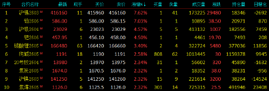 2026年2月25日,国内期货主力合约涨跌互现。沪锡、铂涨超7%,沪银、钯涨超4%,碳酸锂涨超3%。跌幅方面,集运指数(欧线)跌超4%,液化石油气(LPG)、低硫燃料油(LU)跌超1%。