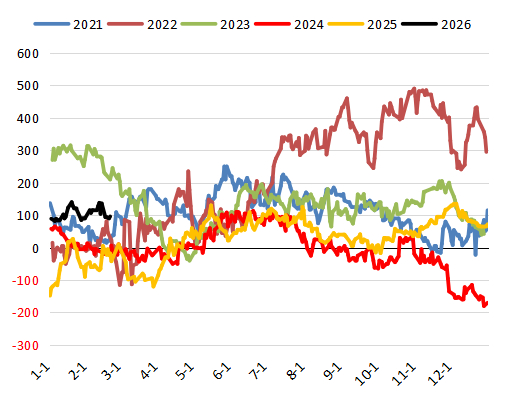 2026年1月起印度港口的毛豆油和毛棕榈油价差是偏高的,葵花籽油价格比棕榈油更高,印度溶剂萃取商协会预估1月进口棕榈油76.6万吨,高于2025年12月的50.72万吨,豆油进口减少44%以上至27.9万吨,葵花籽油进口下降23.8%至23.7万吨。截至2月20日,印度港口毛豆油和和毛棕榈油价差达到96美元/吨,毛葵油和毛棕榈油价差为275美元/吨。进入2月印度卢布结束持续贬值,这将减轻棕榈油换算成卢布一口价的压力,贸易商预估2月印度进口棕榈油继续增加至80万吨。