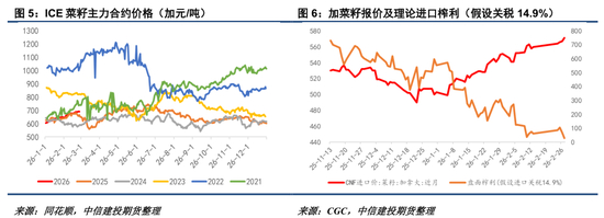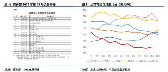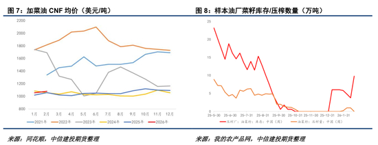 特别地,本次“反歧视”关税取消商品名单当中并不包括加拿大菜油,换言之目前进口加菜油仍需遭受100%关税惩罚。从这个角度来说,加拿大菜油短期内仍无法正常对华出口。另一方面,近期迪拜菜油的CNF参考报价仍在1125美元左右,成本端具备一定支撑。目前中国沿海菜籽库存陆续恢复,但转化为压榨尚需一段时间,我们倾向于菜油在短期内的供应端支撑要高于菜粕。