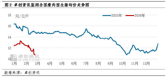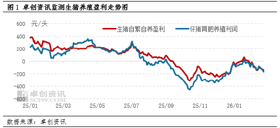 从供需基本面来看,春节后居民家庭库存肉充足,餐饮、团体消费恢复缓慢,终端需求进入传统淡季;而养殖端适重猪源供应充足,市场供应压力不减,供需失衡进一步压制猪价,成为猪价下跌的核心推手。截至25日,卓创资讯监测2月份全国瘦肉型生猪均价为11.68元/公斤,月内价格加速走低,25日全国瘦肉型生猪均价更是跌至10.74元/公斤,创下阶段性新低。猪价持续下行,使得生猪销售收入大幅减少,而养殖端饲料等成本相对刚性,自繁自养与仔猪育肥盈利同步减少,亏损幅度加深。