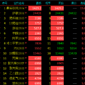 2026年3月2日,国内期货主力合约大面积飘红,集运欧线、燃油、低硫燃料油(LU)、SC原油、甲醇、纯苯、丙烯、聚丙烯液化石油气(LPG)、乙二醇(EG)均触及涨停,沪银涨超9%,对二甲苯(PX)、PTA、合成橡胶涨超6%。跌幅方面,多晶硅跌超2%,生猪跌近2%。