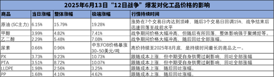 作为参考,我们来看一下2025年6月12日的“12日战争”对化工品价格的影响,主要局限于成本传导,成本传导表现为原料价格和运费两方面: