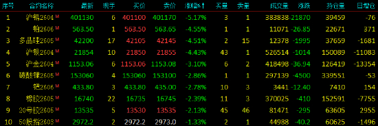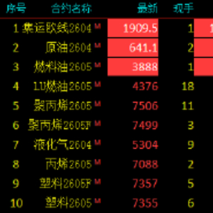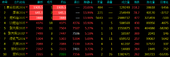 2026年3月4日,国内期货主力合约涨跌不一,集运欧线、SC原油、燃料油连续第三日触及涨停,低硫燃料油(LU)涨近11%,液化石油气(LPG)、聚丙烯(PP)涨超5%,塑料、丙烯涨近4%。跌幅方面,沪锡跌超5%,多晶硅、铂、沪银跌超4%,沪金跌超3%。