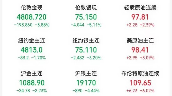 外盘方面,金银价格大幅下跌,布伦特原油期货主力合约涨逾6%。