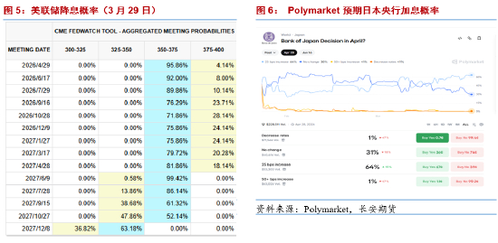 这种“美元流动性边际紧缩”与“海外滞胀风险上升”的组合,正在重塑全球宏观交易逻辑。一方面,美元流动性收紧直接抬高了全球资产的融资成本,压制了估值;另一方面,海外主要经济体为应对滞胀风险可能被迫推迟降息甚至转向紧缩(如日本)。以此来看,市场对美联储对于流动性的态度变得较为微妙,作为石油的净出口国,美国可能可以和高CPI、高油价共生。3月27日,市场对未来一年各月份的加息25bp概率均下跌了10个百分点,降息概率小幅提高。市场对于衰退的恐慌也有可能倒逼美联储维持现有利率不变,进而为黄金价格底部提供一定的支撑。