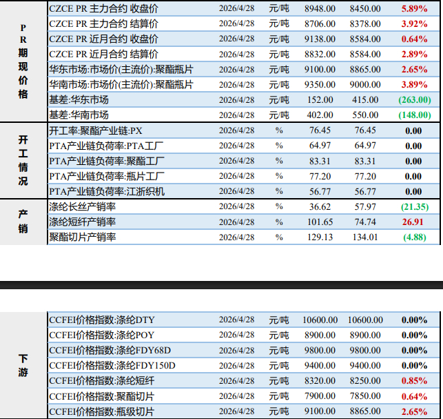 受成本影响波动加剧,PR2606合约以8948元/吨(6.80%)收盘,日内成交量7.19万手。行业开工率暂无明确变化,市场现货流动性趋紧,下游终端谨慎观望为主,外需表现较好,对价格存在支撑。